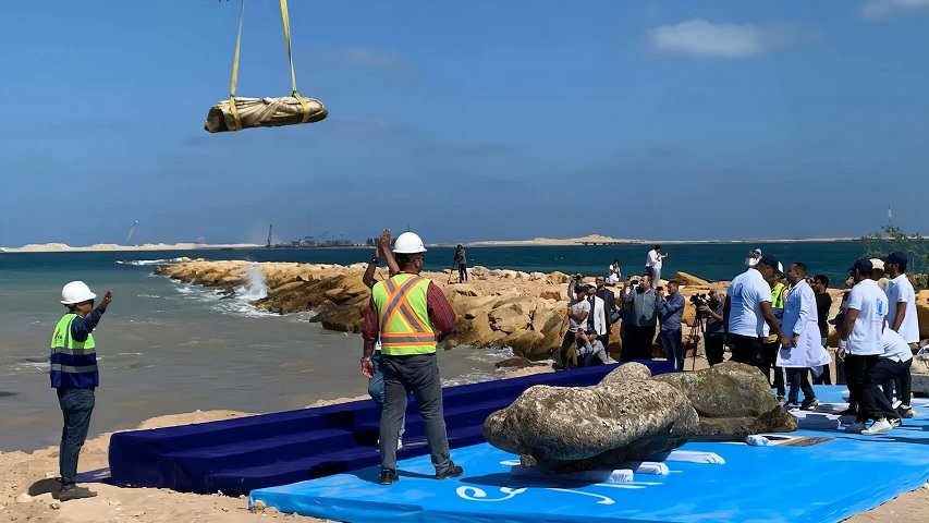 La extracción de las piezas combinó el trabajo de buzos profesionales y grúas especializadas. Las estructuras fueron envueltas en arneses, liberadas de los sedimentos y elevadas con extremo cuidado. Entre los objetos recuperados destacan estatuas de figuras reales, esfinges prerromanas y una con el cartucho de Ramsés II. También se halló una estatua decapitada de época ptolemaica y la base de otra que habría pertenecido a un noble romano. Además, apareció un barco mercante, anclas de piedra y una grúa portuaria vinculada al muelle de 125 metros que servía como puerto en tiempos bizantinos.